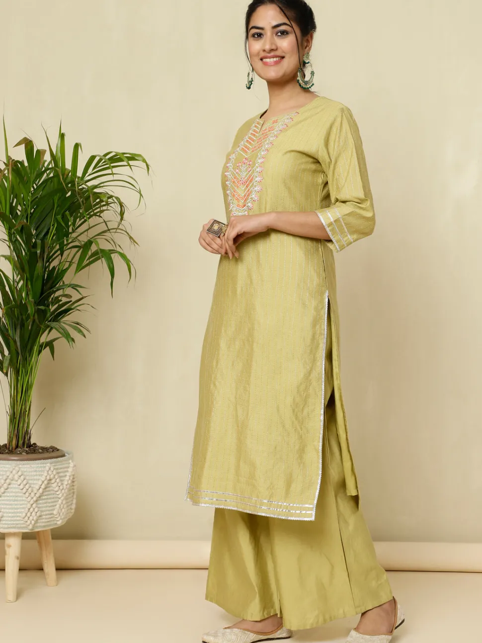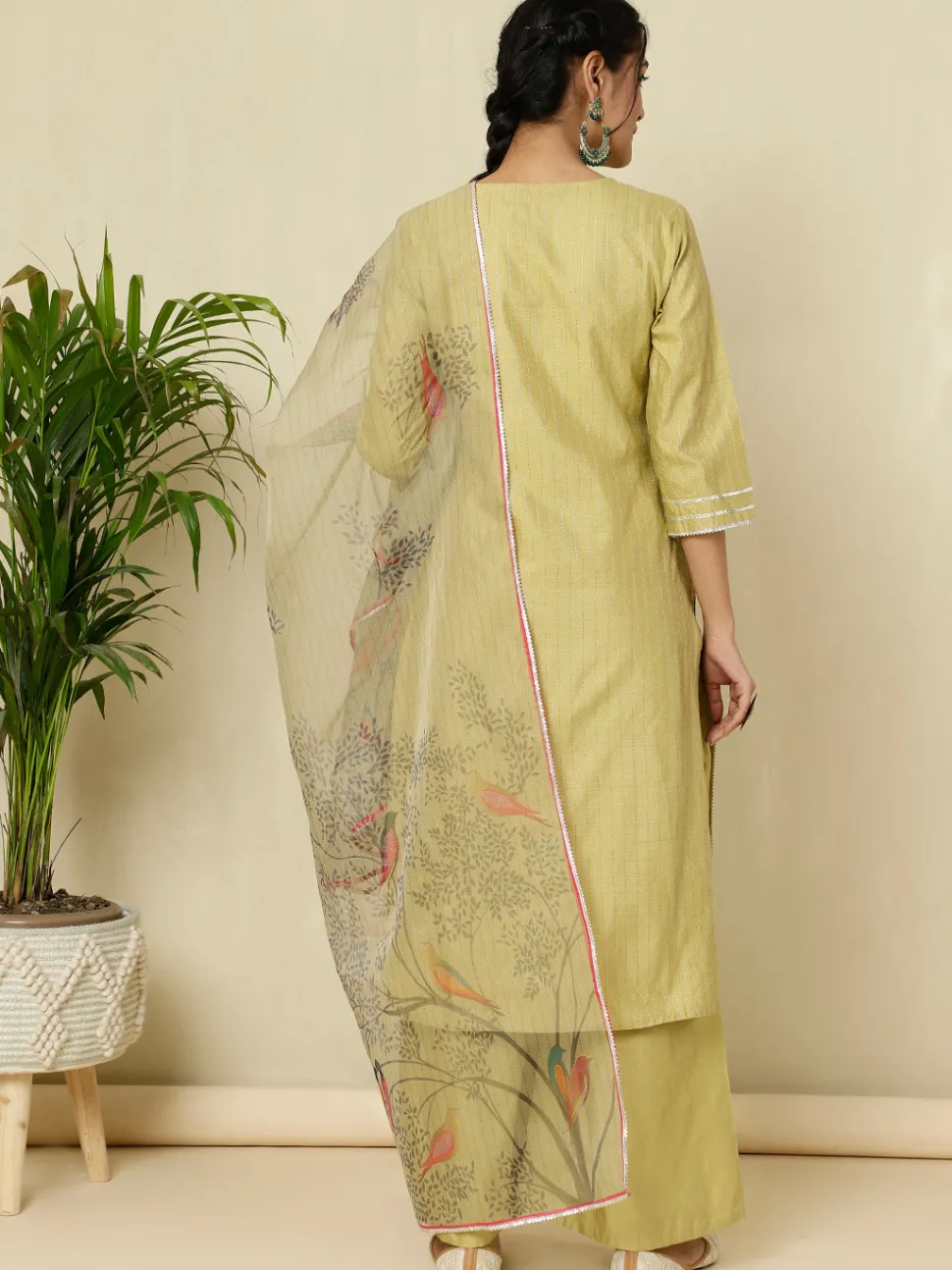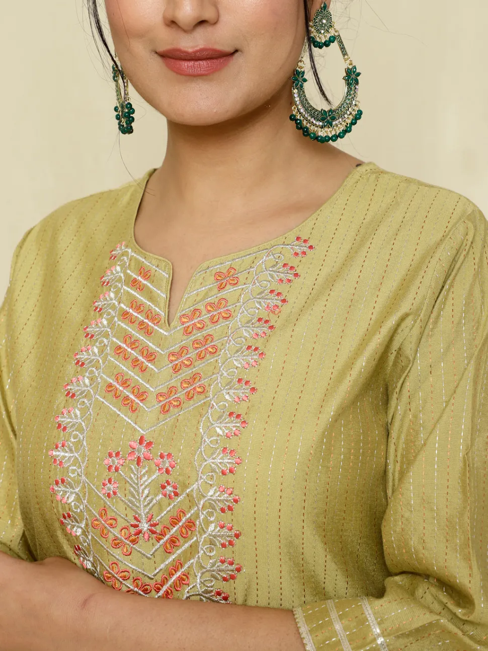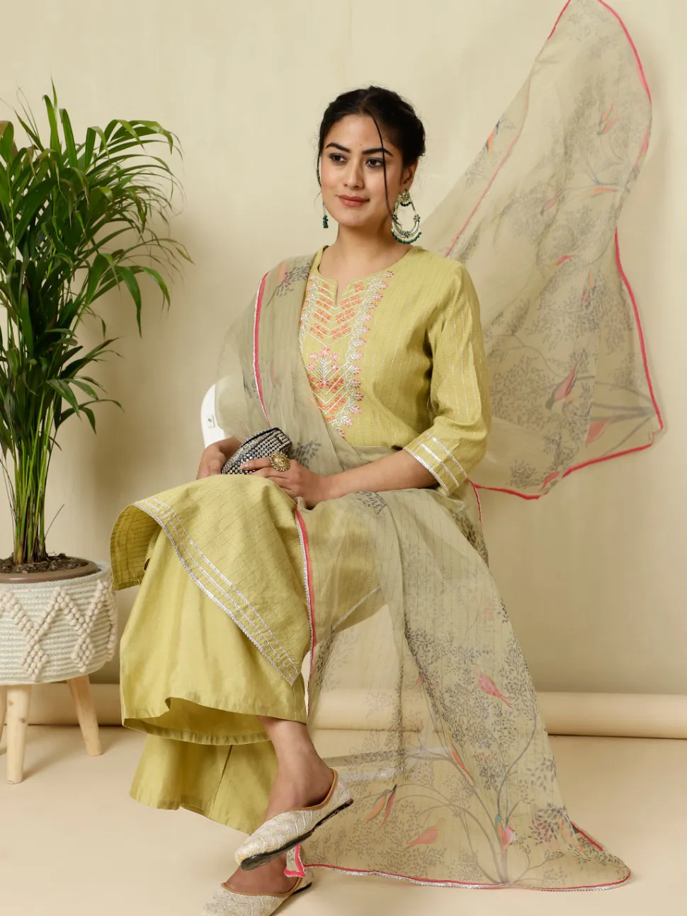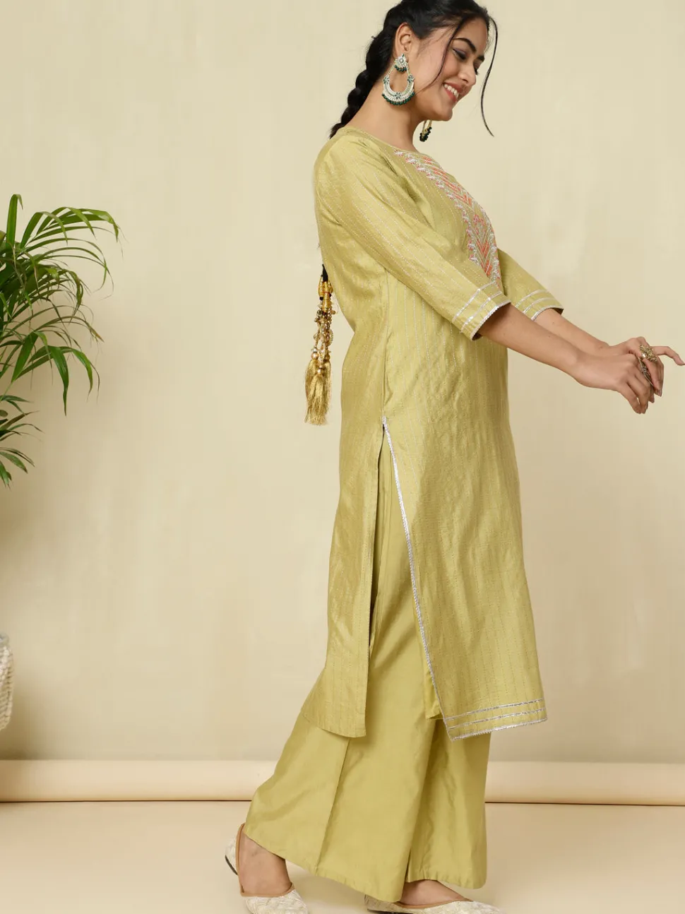 This Green Chanderi Kantha Embroidered Kurta With Palazzo And Dupatta is a festive essential. The kurta has chanderi kantha fabric with an embroidered yoke, round neckline and three-quarter sleeves. Paired with a solid palazzo and digital printed dupatta.