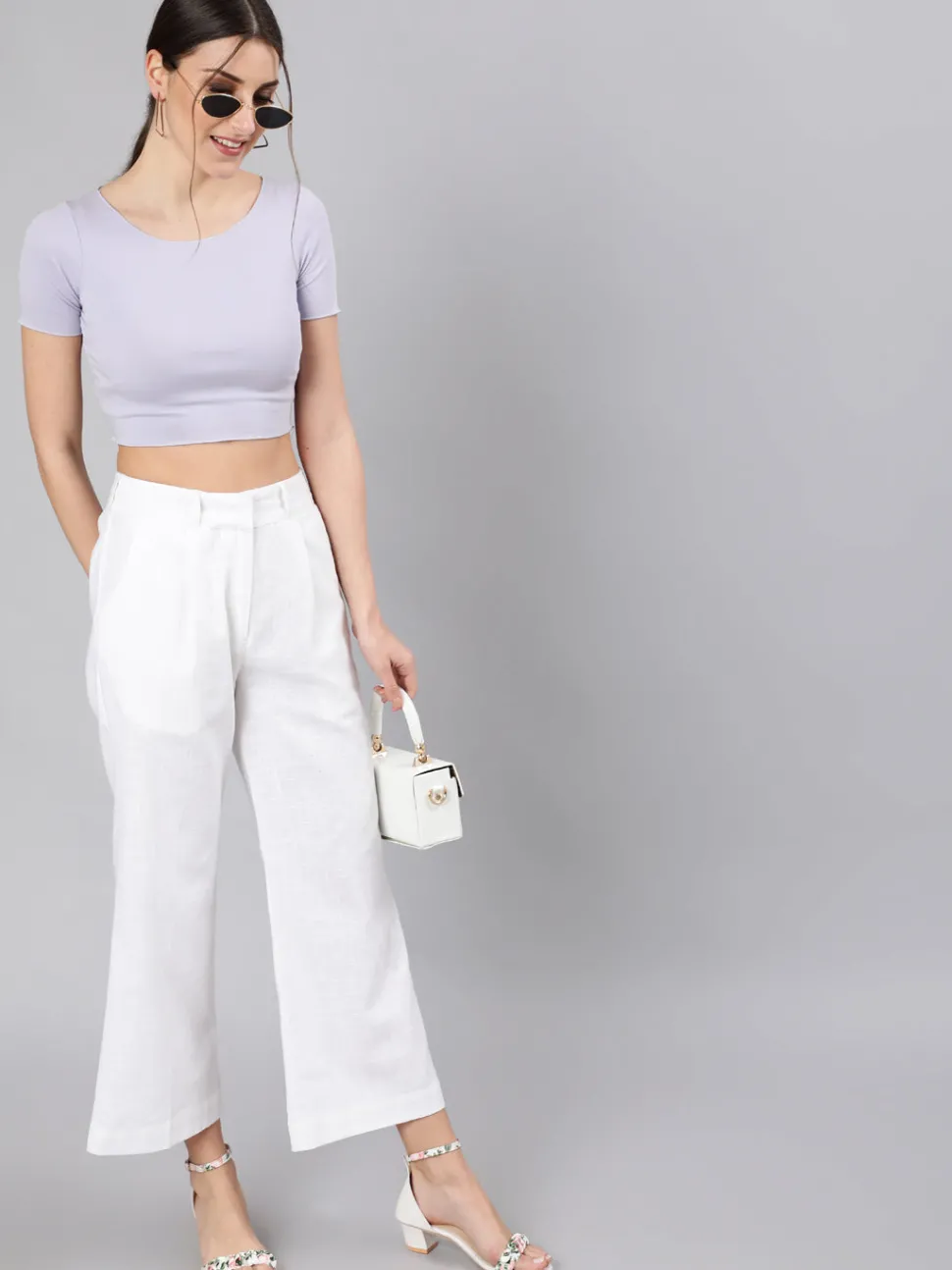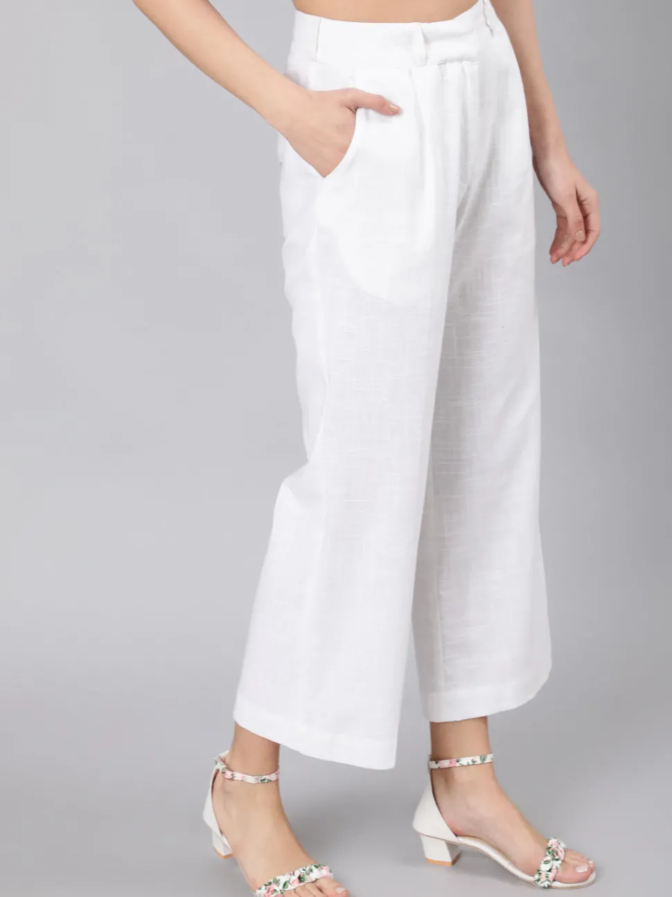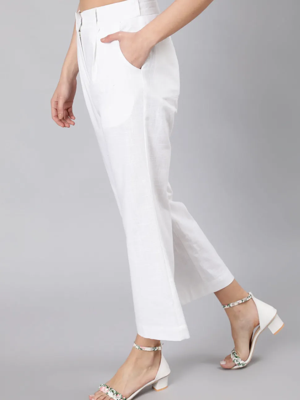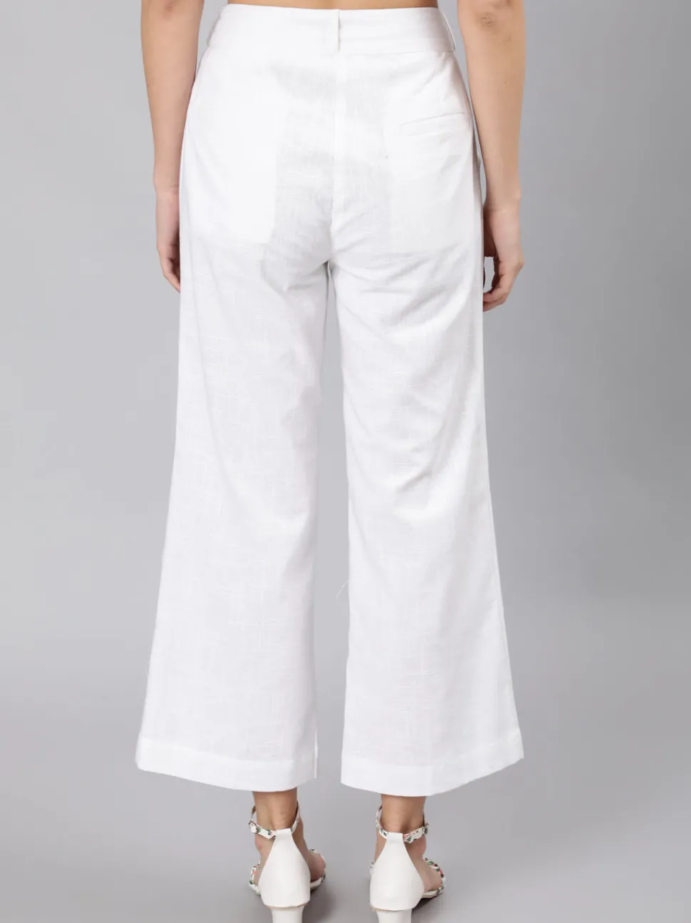 Make a statement in our white cotton slub flared high-rise parallel pants. Featuring front pleat details in front, hook and eye closure at waistband and side pockets.
