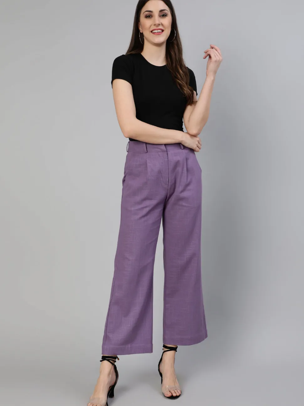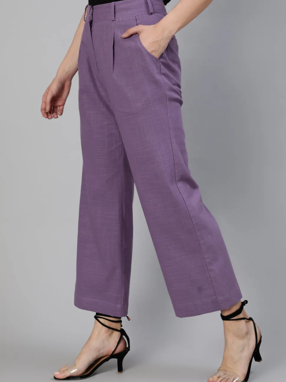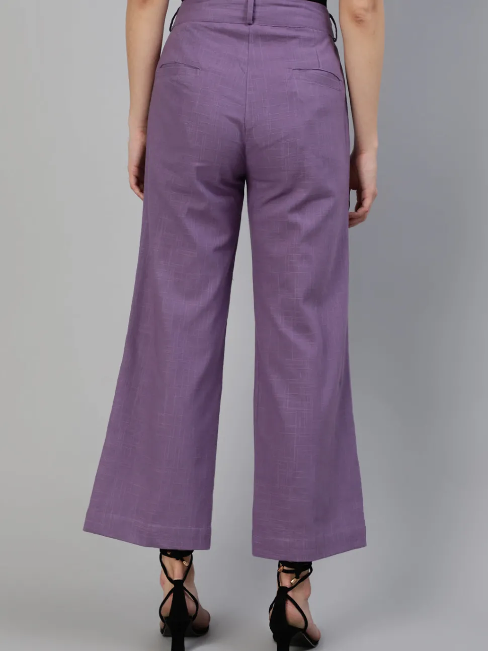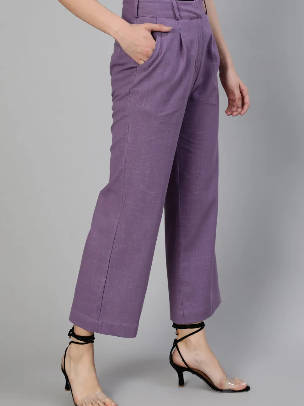 Make a statement in our lavender cotton slub flared high-rise parallel pants. Featuring front pleat details in front, hook and eye closure at waistband and side pockets.