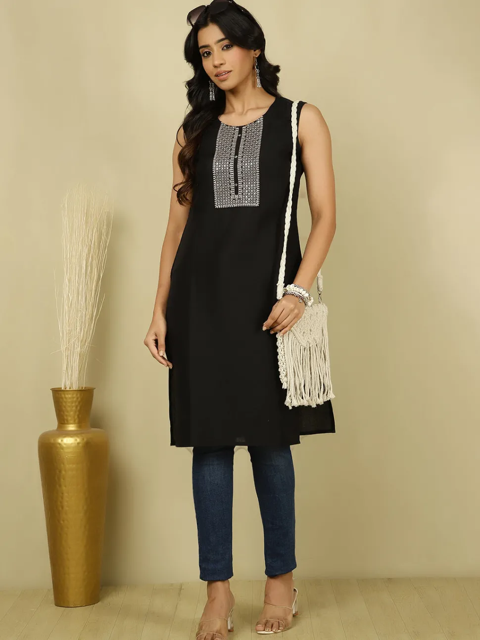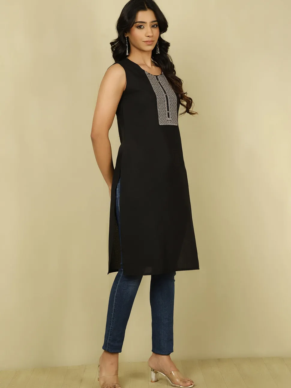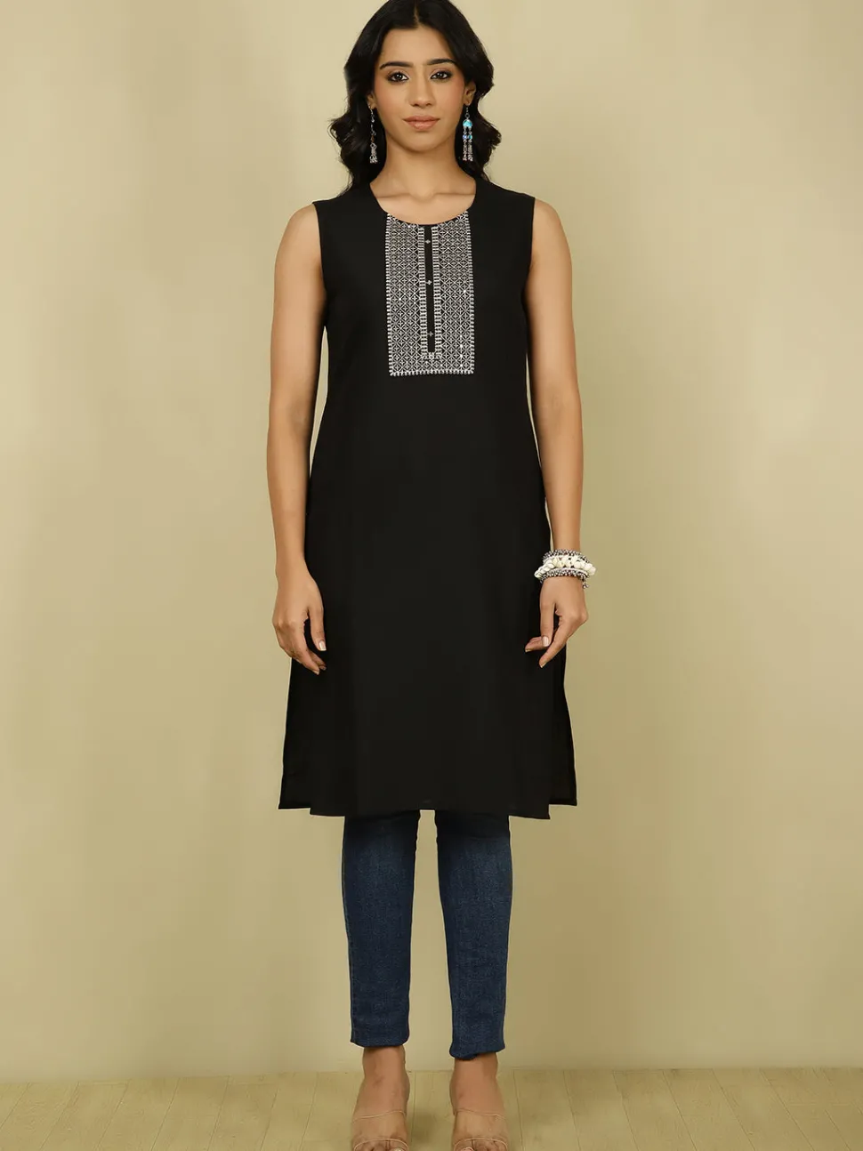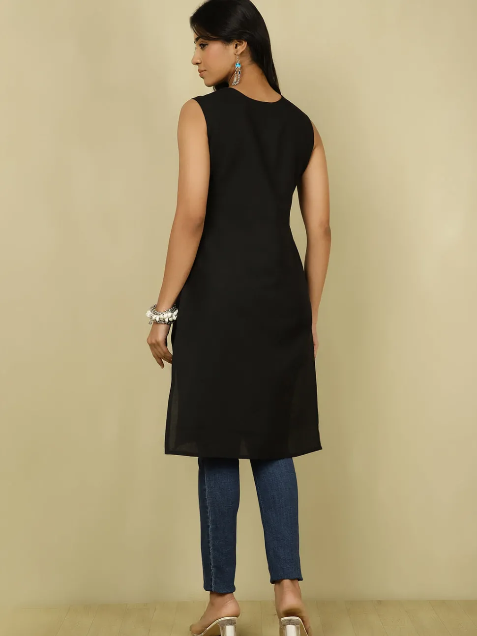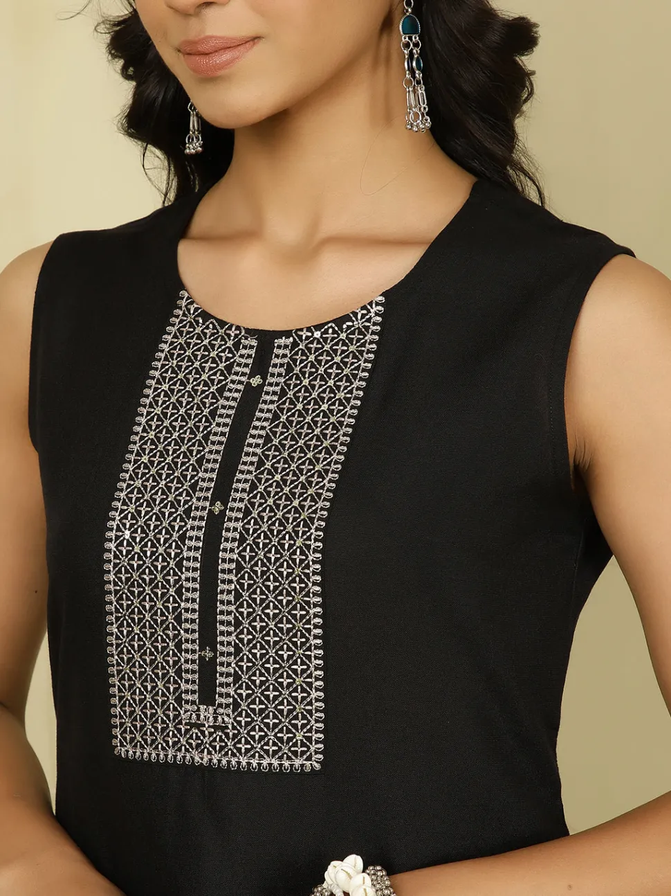 Perfect for summer season, this Black Embroidered Sleeveless Kurta has a round neck, embroidered yoke and straight hemline.