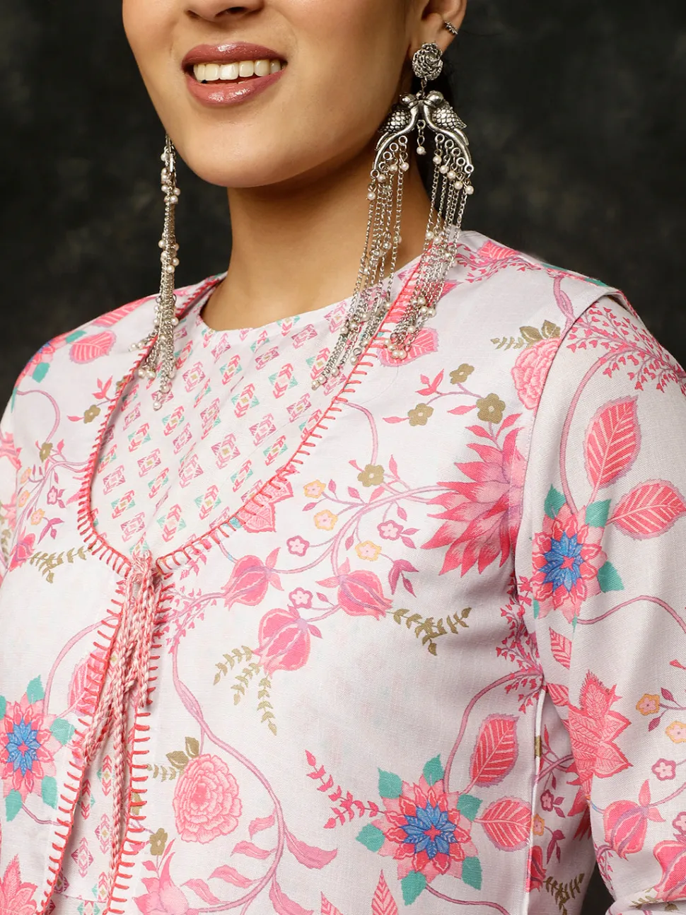 Add this unique Grey Ethnic Print Flared Kurta With Shrug And Pants to your festive closet. Featuring a flared kurta with ethnic motifs, a round neckline, three-quarter sleeves and white lace details. It is paired with Floral print pants and a sleeveless shrug with front tassels.