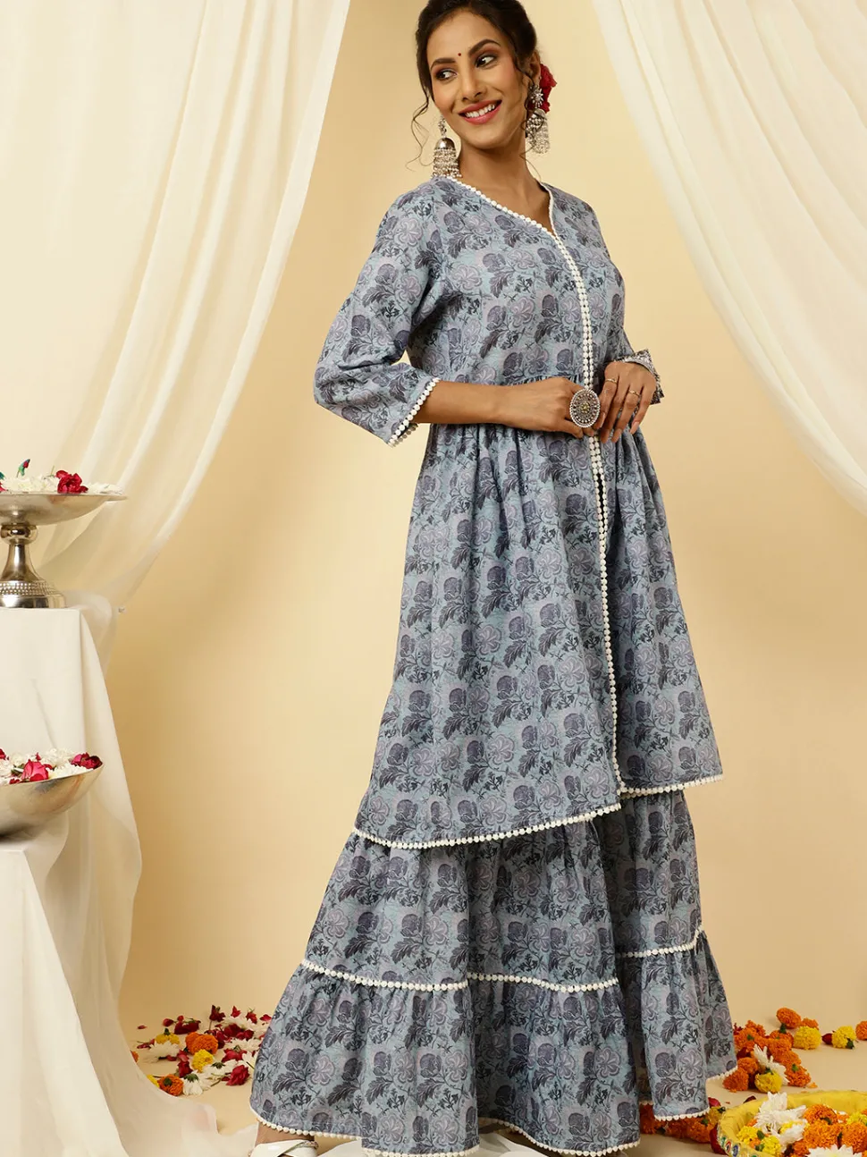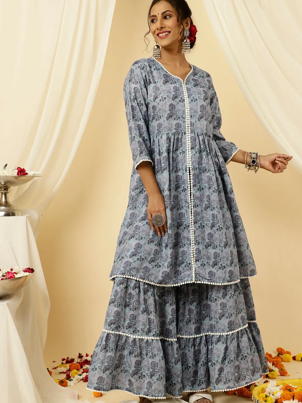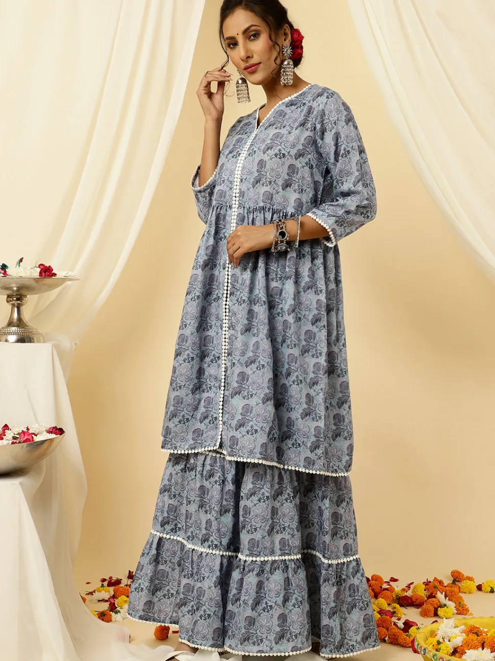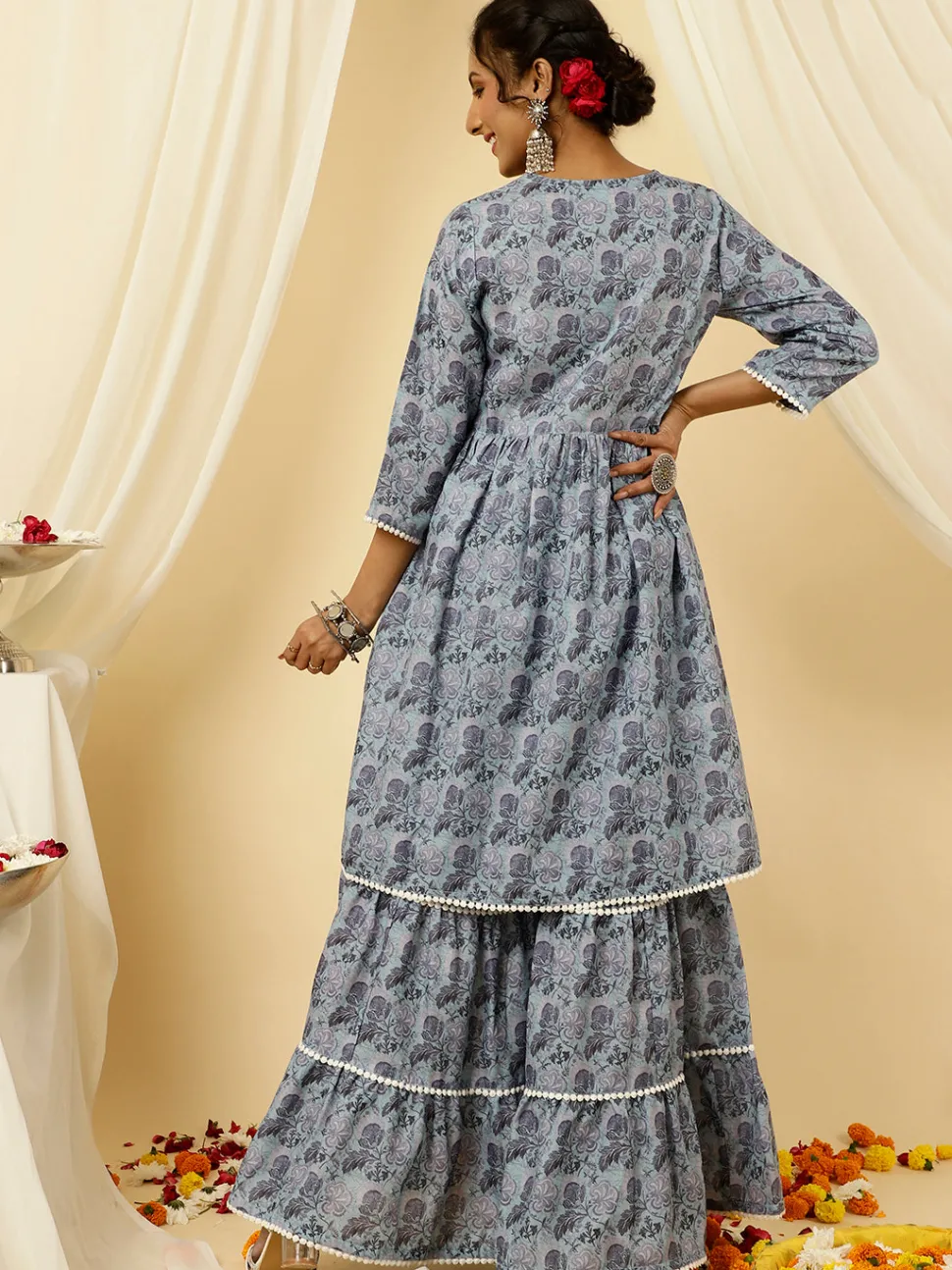 Flowy and fabulous, this Blue Floral Print Flared Kurta With Sharara is made exclusively for special days. The flowy kur…