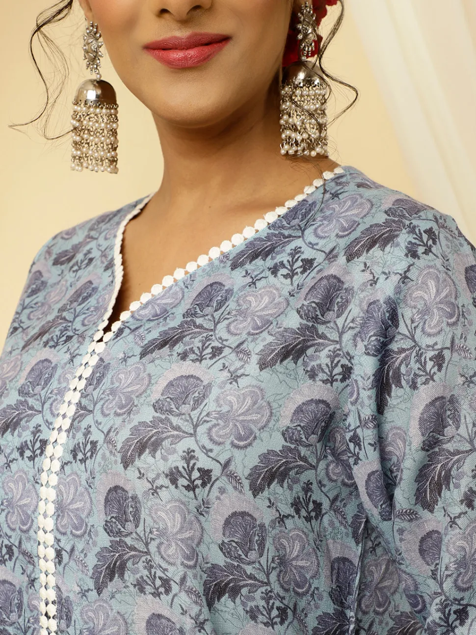 Flowy and fabulous, this Blue Floral Print Flared Kurta With Sharara is made exclusively for special days. The flowy kurta has a v-neckline, front slit, and three-quarter sleeves. Paired with a flowy sharara which has an elasticated waistband and pockets. The white lace details all over add a special element.