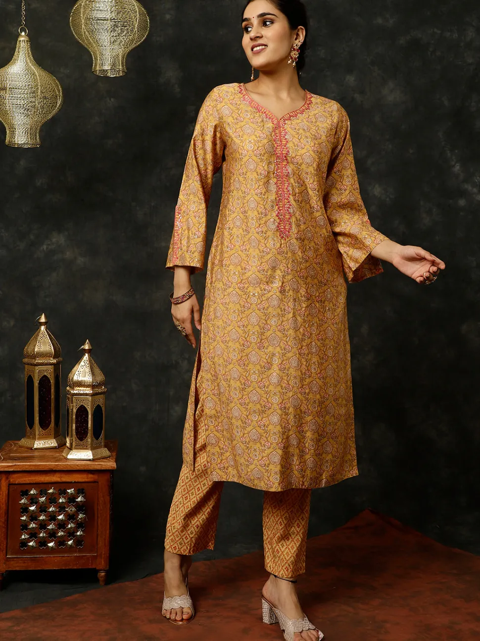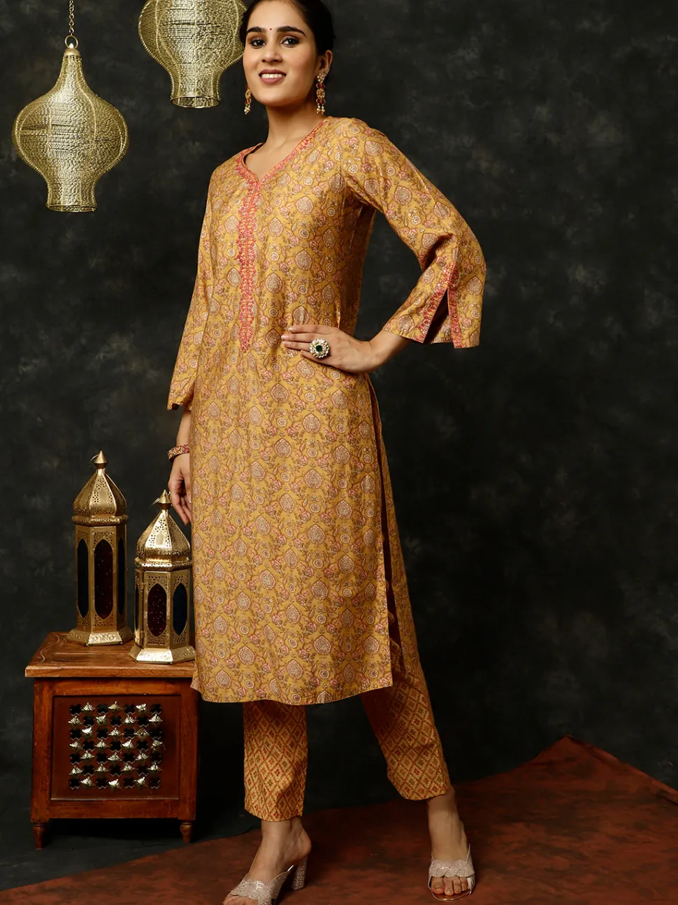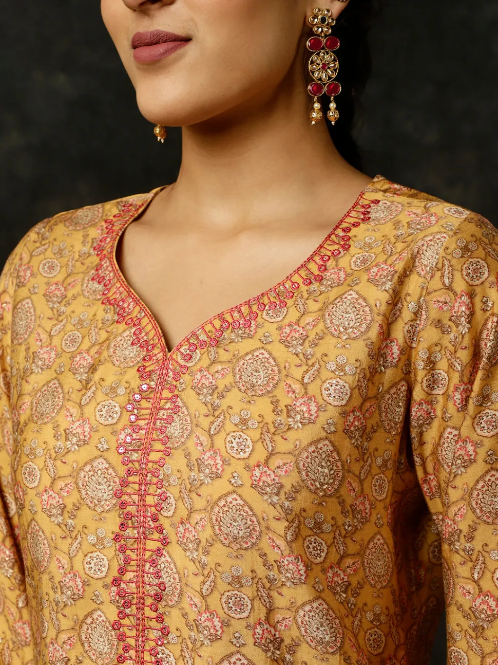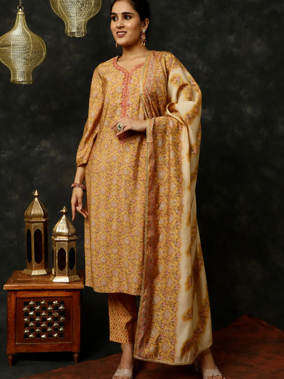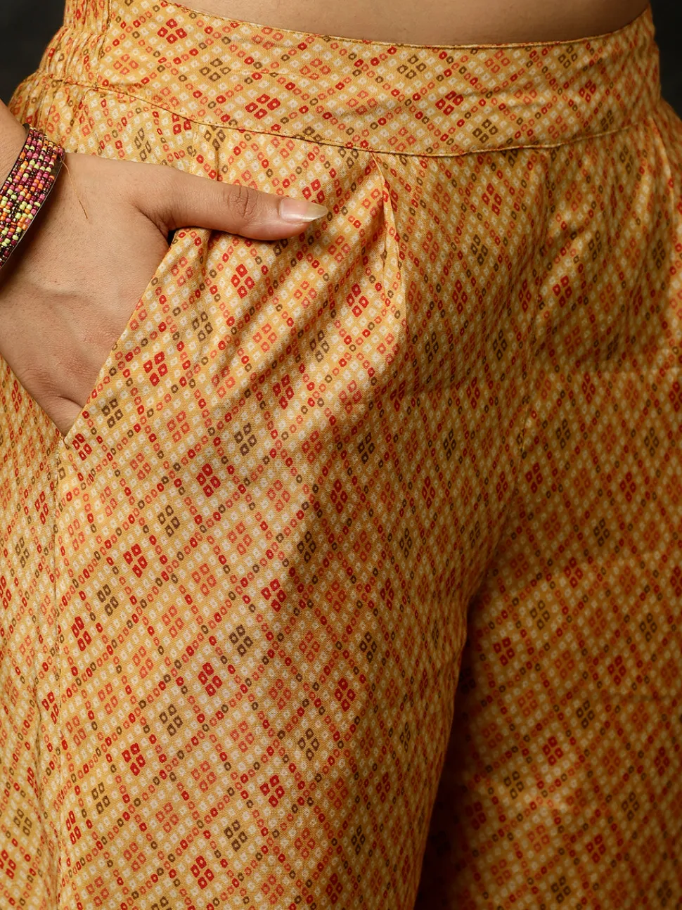 Add this beautiful Yellow Foil Printed Kurta With Pants And Dupatta to your festive wardrobe. The kurta has a straight h…