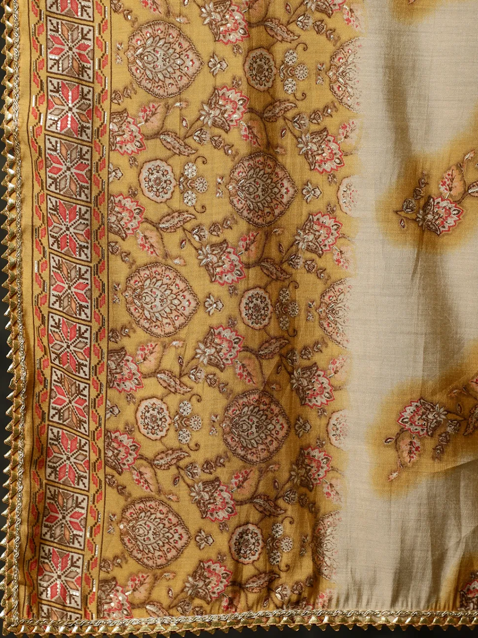 Add this beautiful Yellow Foil Printed Kurta With Pants And Dupatta to your festive wardrobe. The kurta has a straight hemline, sequins embroidered details on the sleeves and a sweetheart neckline. Paired with a printed partially elasticated waistband and golden lace embellished dupatta.