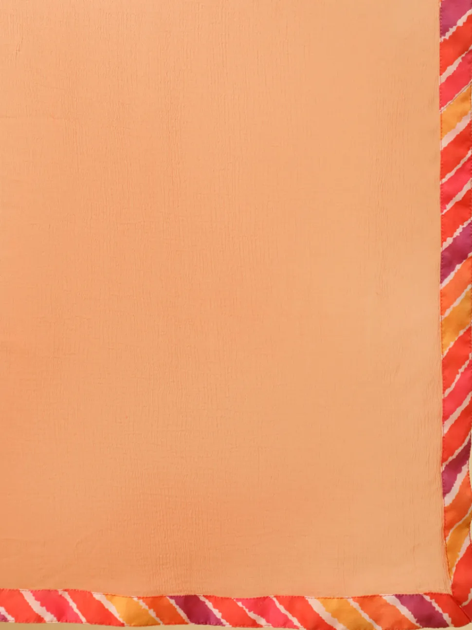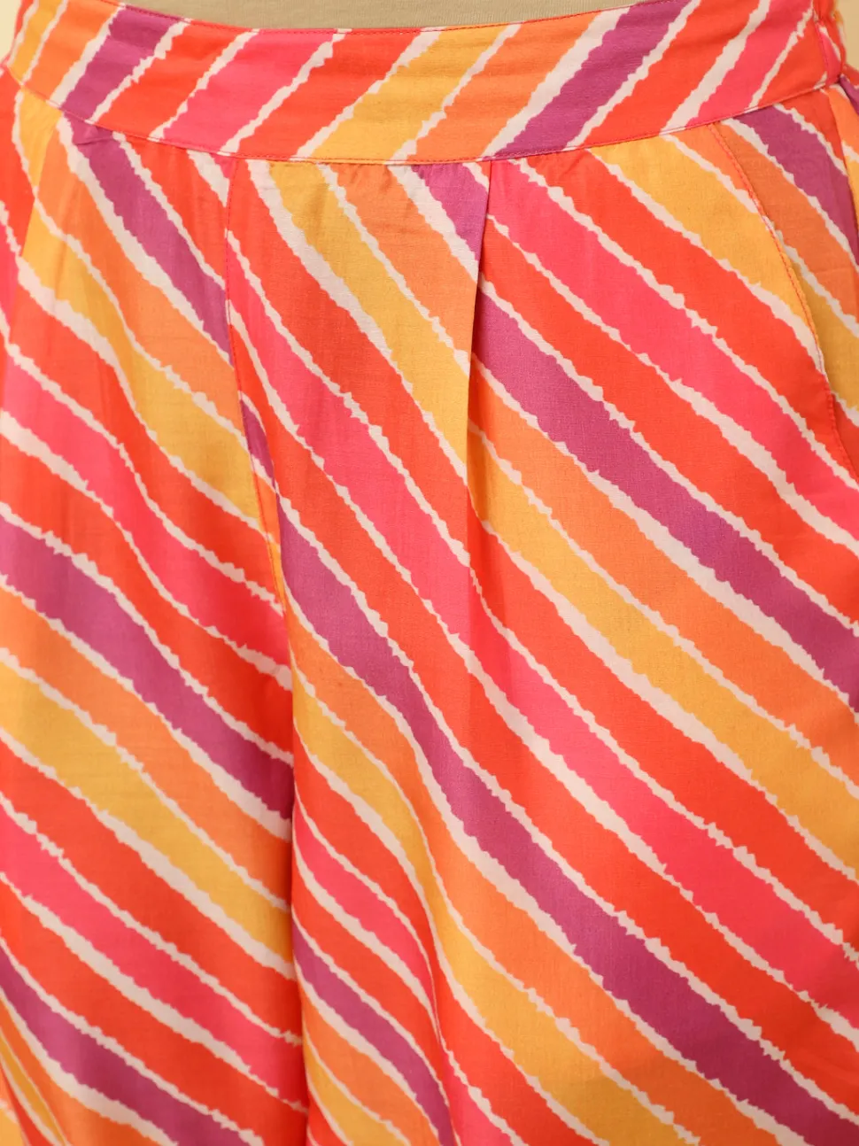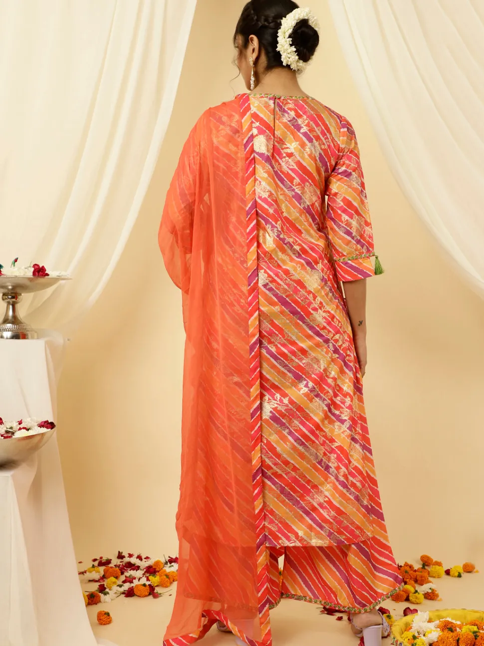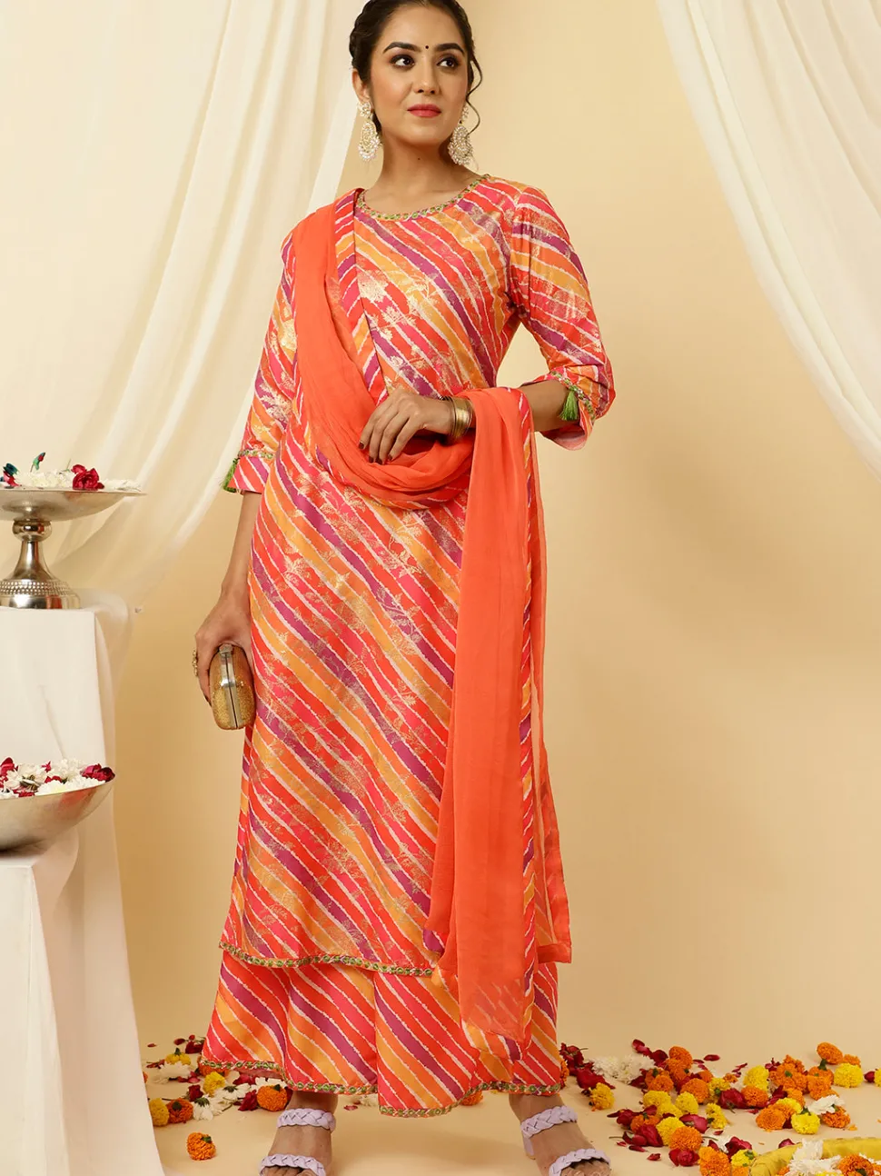 Embrace festive vibes in this Orange Leheriya Straight Kurta With Palazzo And Dupatta. Made in modal muslin fabric the k…
