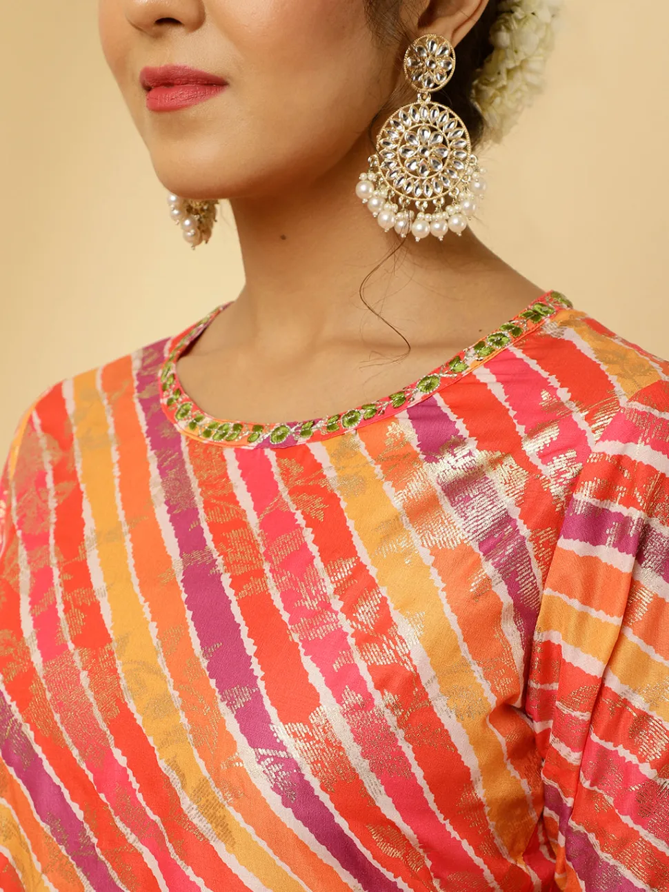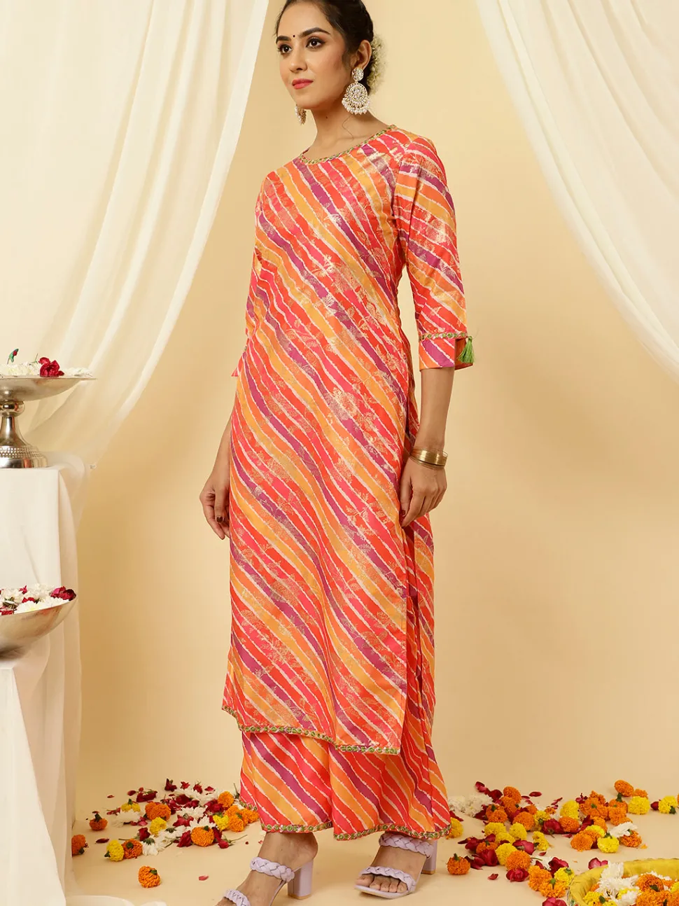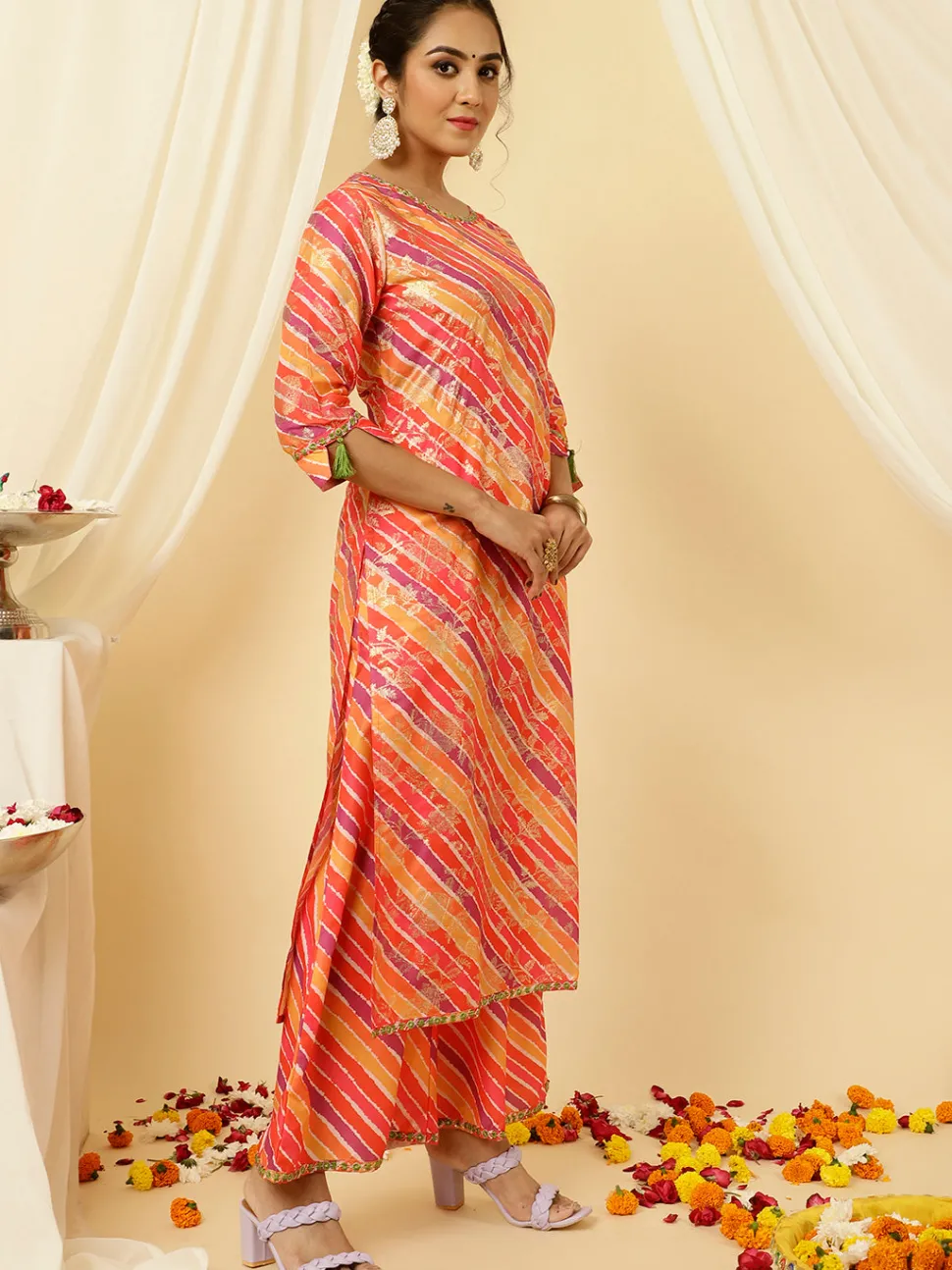 Embrace festive vibes in this Orange Leheriya Straight Kurta With Palazzo And Dupatta. Made in modal muslin fabric the kurta has a round neckline with thread and sequin work, three-quarter sleeves and foil prints. Paired with a lehriya print palazzo and solid dupatta.