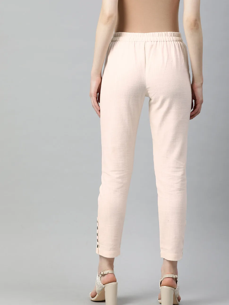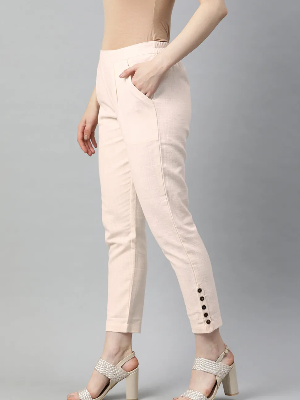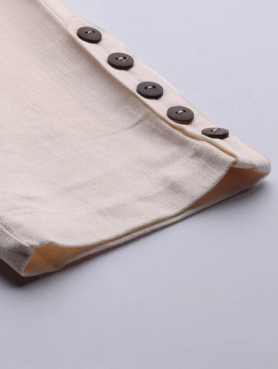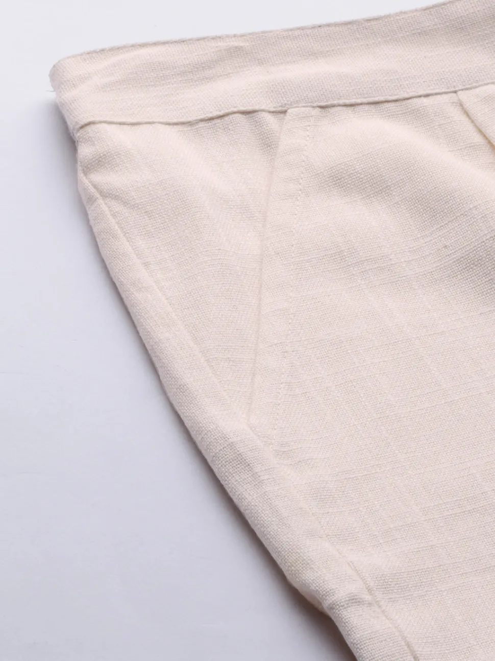 Elevate your look with these Off White Cotton Slub Pants. It features front pleats, wooden button details at the hemline, both side pockets and a partially elasticated waistband.