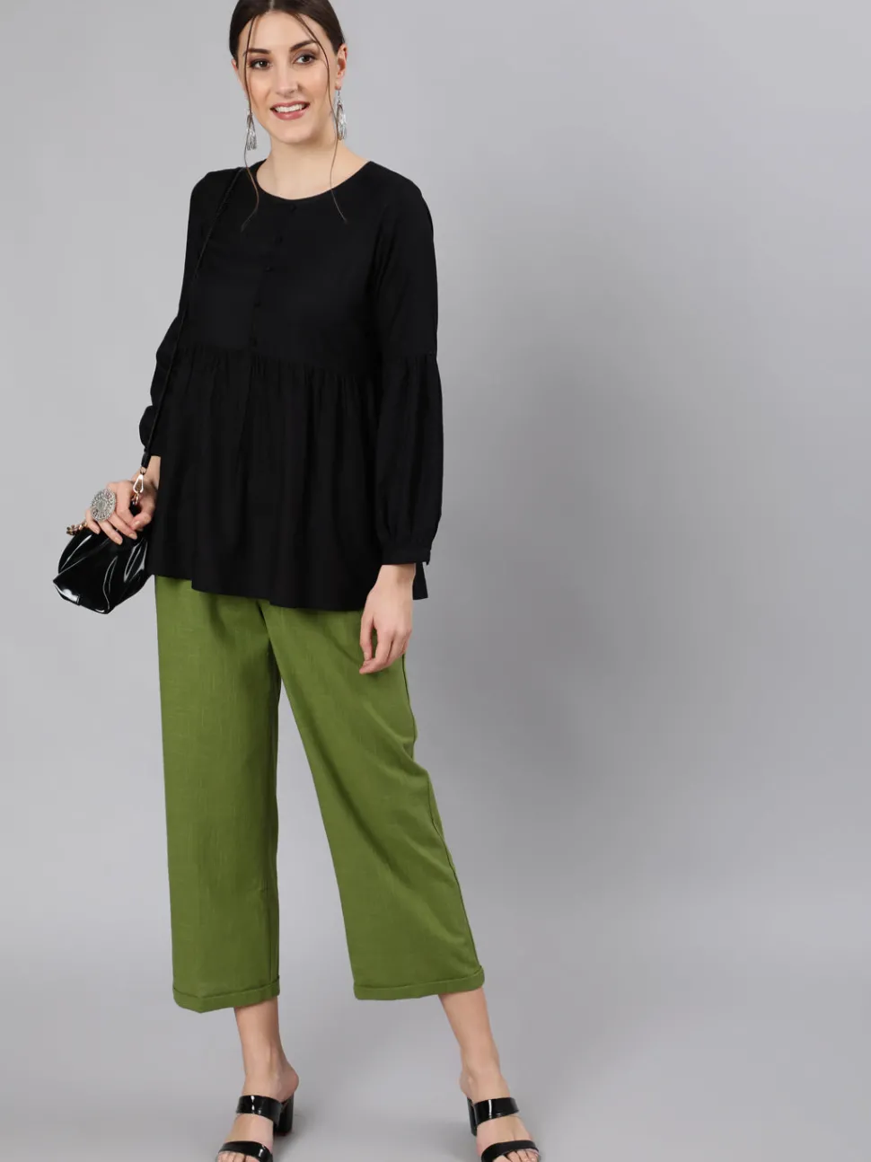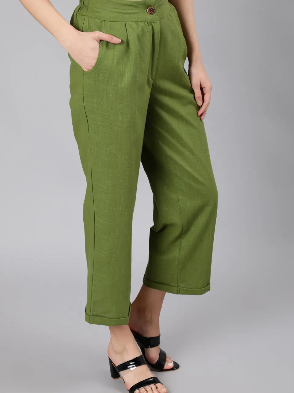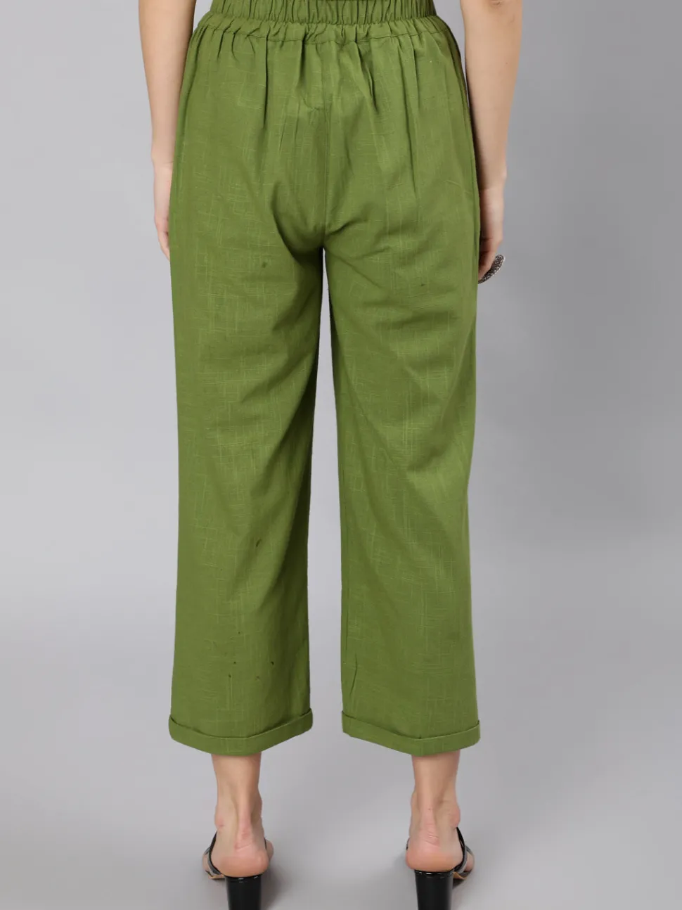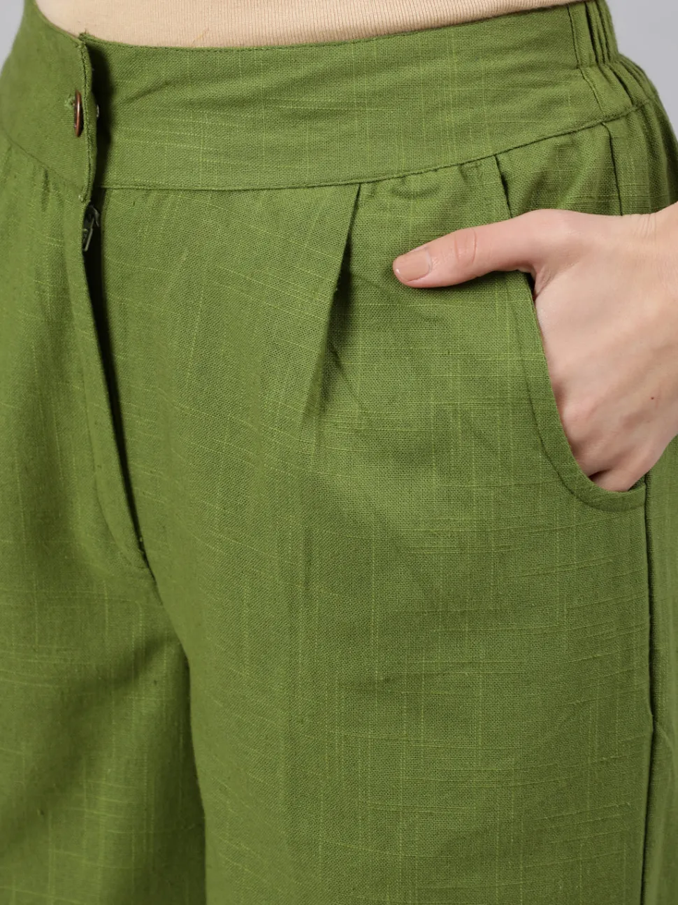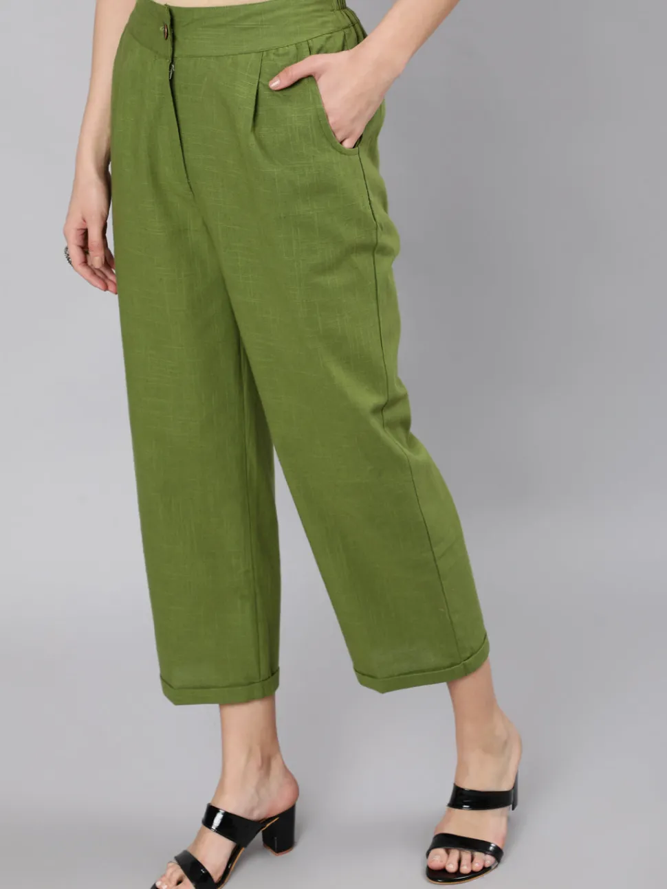 Embrace an elegant style in this olive cotton slub straight high-rise pants with front pleats, metal button closure, a partially elasticated waistband, both side pockets and a fold pattern on the hems.