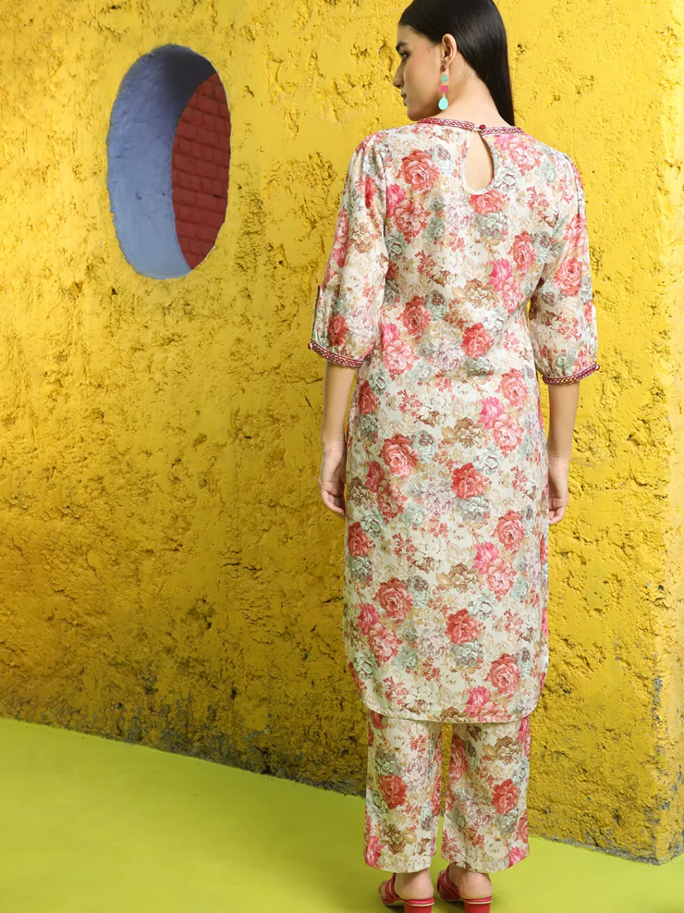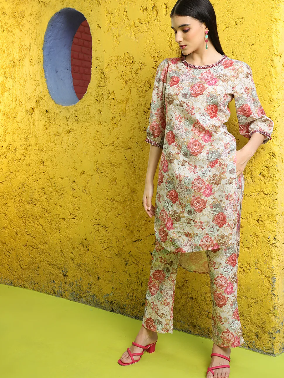 Make a refreshing style statement in this Peach Rose Floral Printed Kurta With Pants. Made in viscose rayon fabric, the kurta features a round neckline, high-low hemline, mirror work lace on the borders and cuffed three-quarter sleeves. Paired with partially elasticated pants which have side pockets.