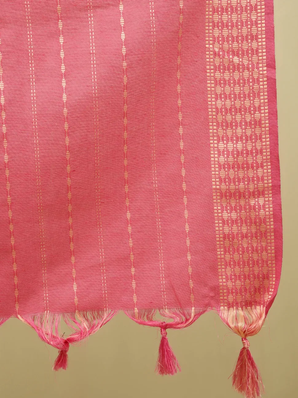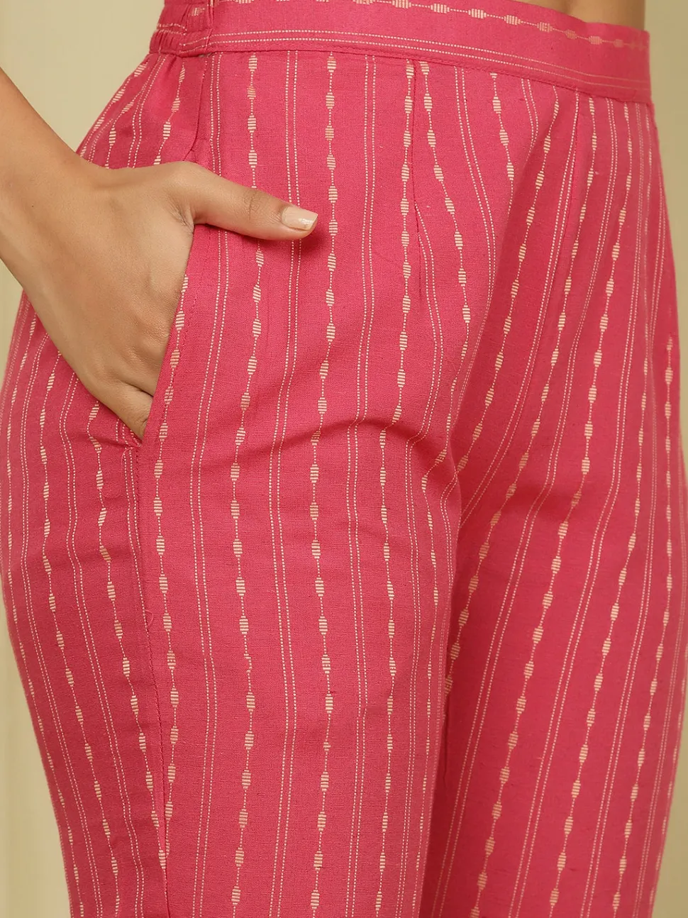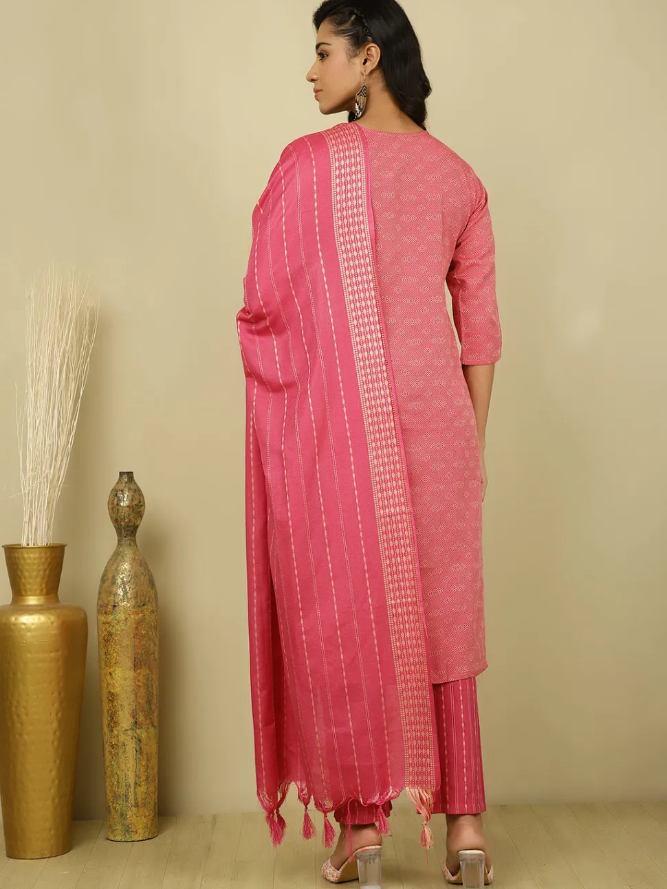 Embrace simplicity with this Self Design Fuchsia Suit Set. The kurta has a sweetheart neck, three-quarter sleeves and a straight hemline. It is paired with regular straight pants and a dupatta with tassels.