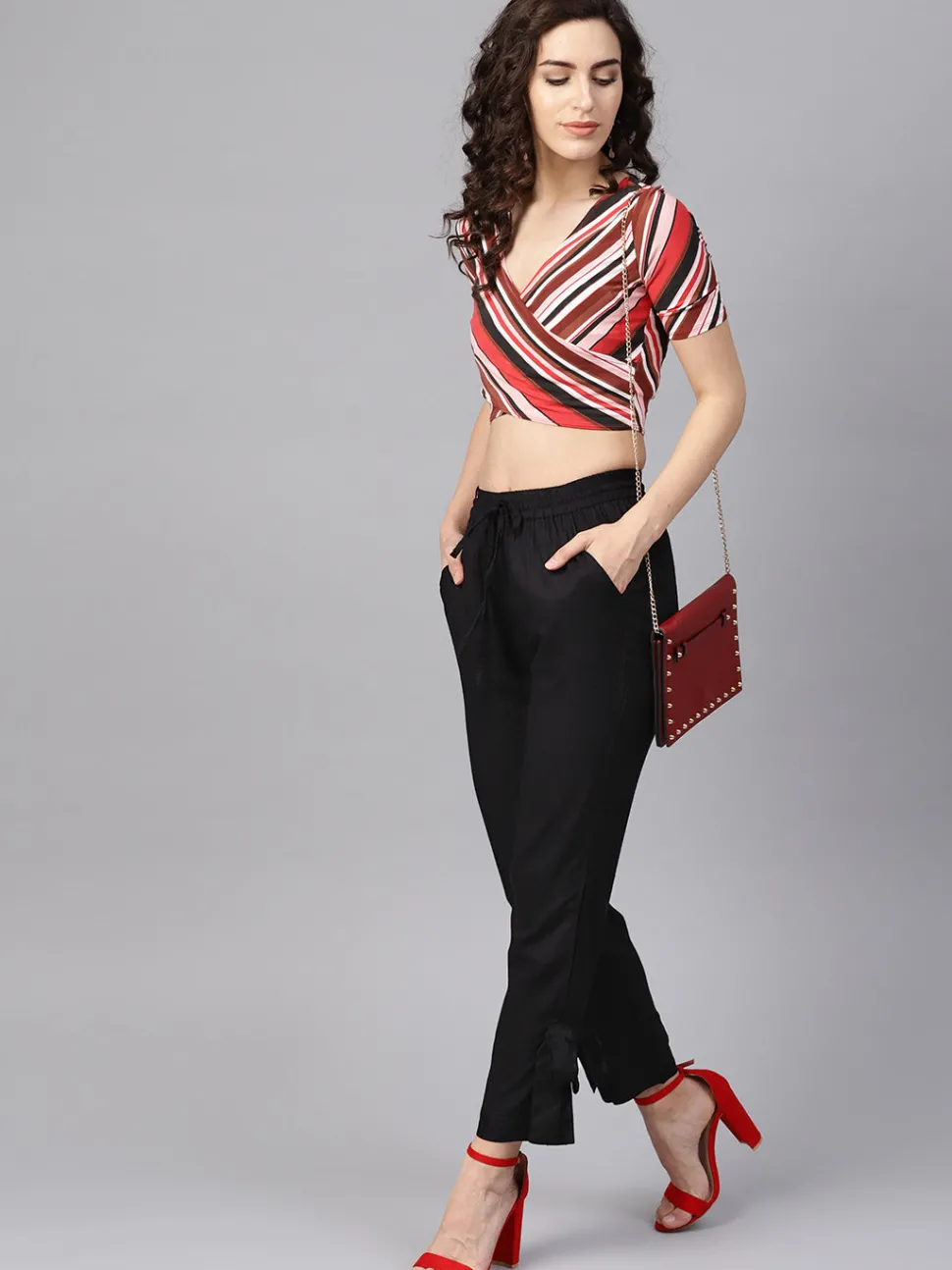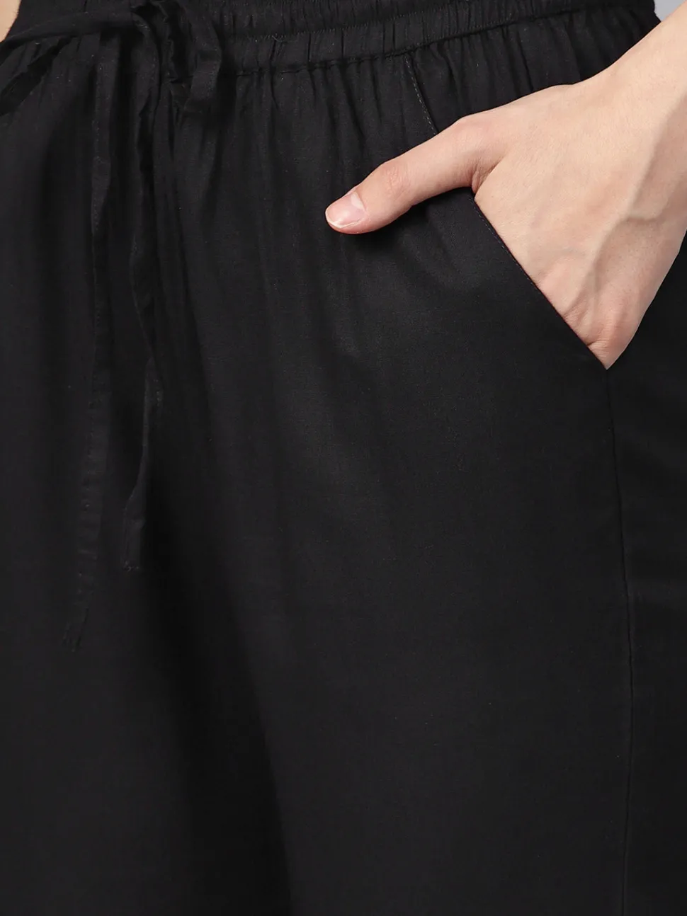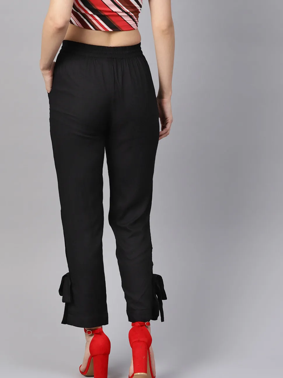 Embrace a chic style in these Black Side Bow Regular Pants. It features a mid-rise fully elasticated waistband with drawstrings, both side pockets and side slits with bows.