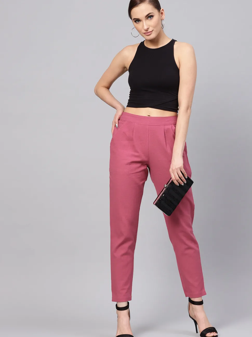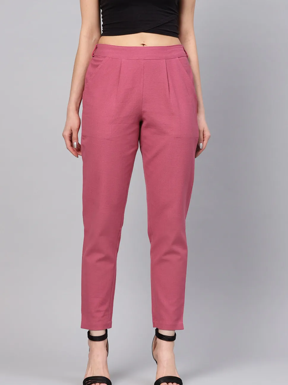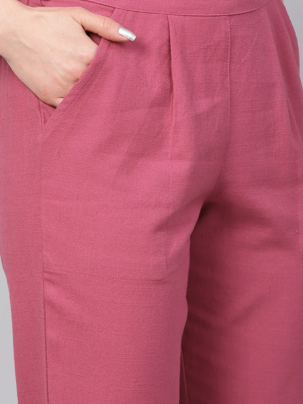 Embrace an elegant style in these Magenta Solid Cotton Slub Straight Pants with front pleats, a mid-rise partially elasticated waistband and both side pockets.