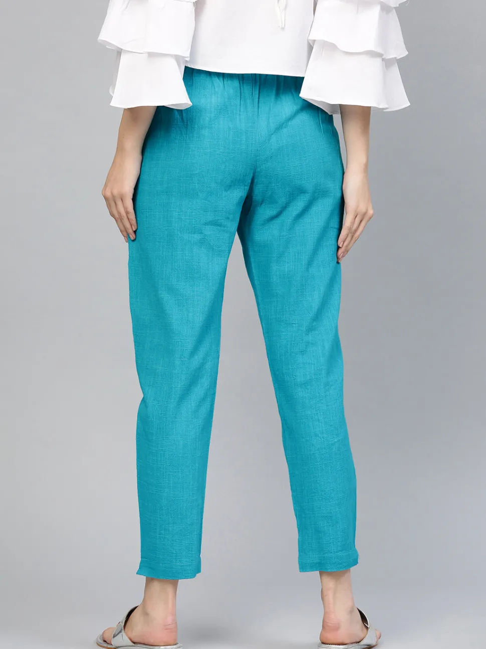 Embrace an elegant style in these Turquoise Blue Solid Cotton Slub Straight Pants with front pleats, a partially elastic…