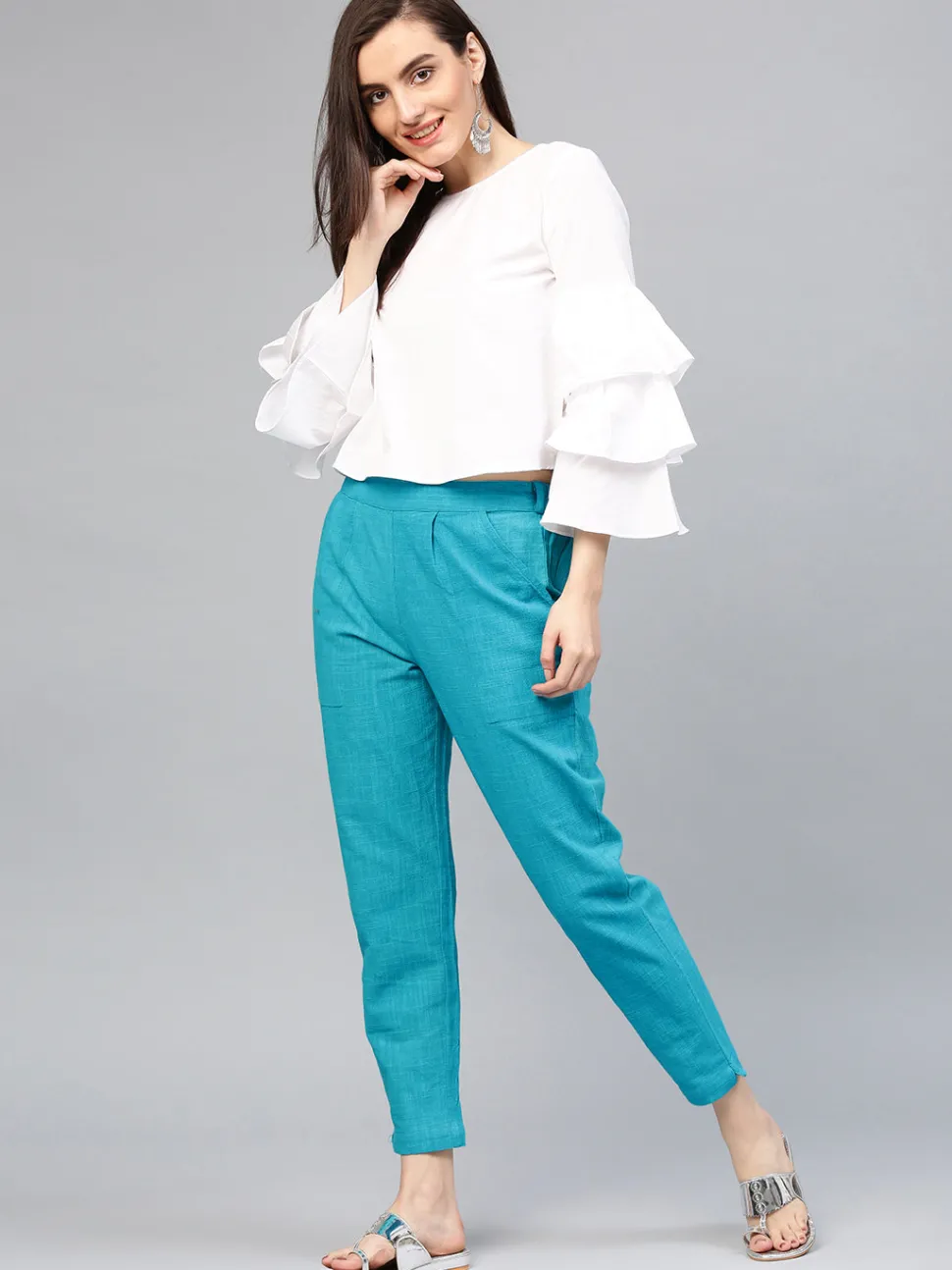 Embrace an elegant style in these Turquoise Blue Solid Cotton Slub Straight Pants with front pleats, a partially elasticated waistband and both side pockets.
