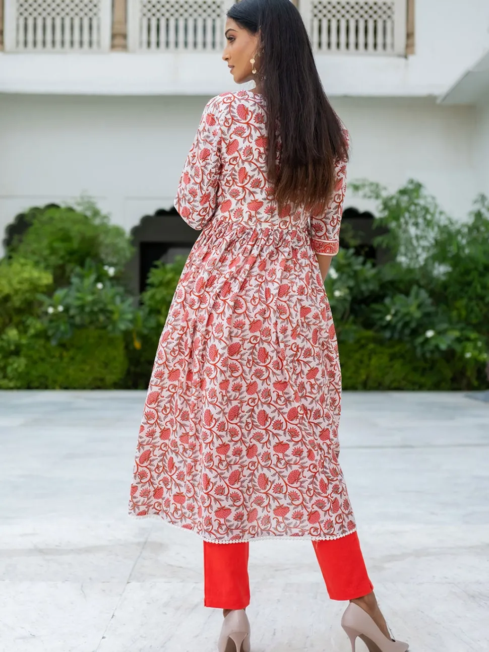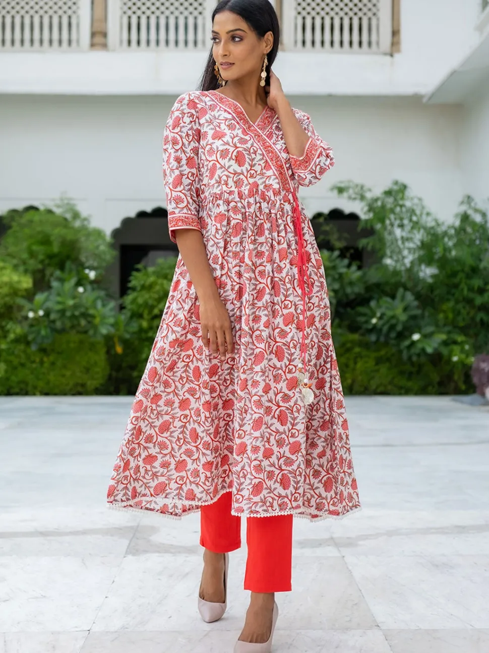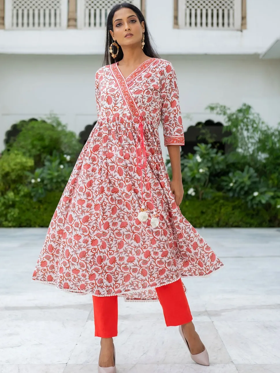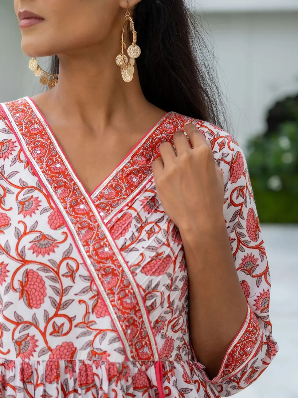 White ethnic motifs printed angrakha cotton kurta has a ‘V’ neck, printed border with sequin detail on the neckline, sle…